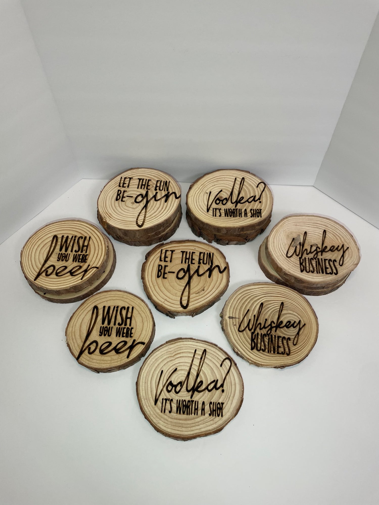 Put your favorite saying on a set of wooden coasters to make any occasion fun! Click to request a custom order!